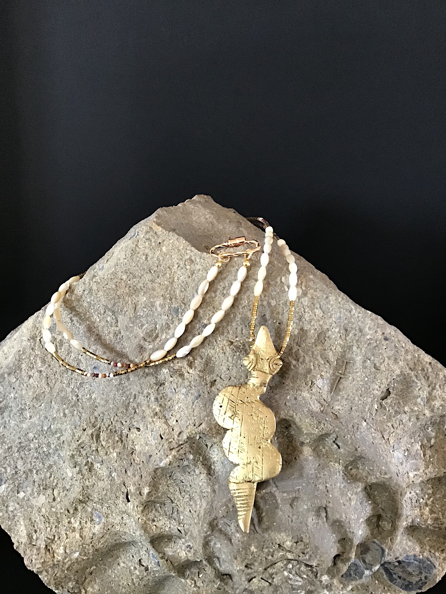 Grand Gecko nacre, c’est une aventure en terre inconnue, ce magnifique gecko en bronze doré sera votre compagnon de l’été. A porter en sautoir ou doublé en ras du coup. Nacre, turquoise , hématite & bronze.