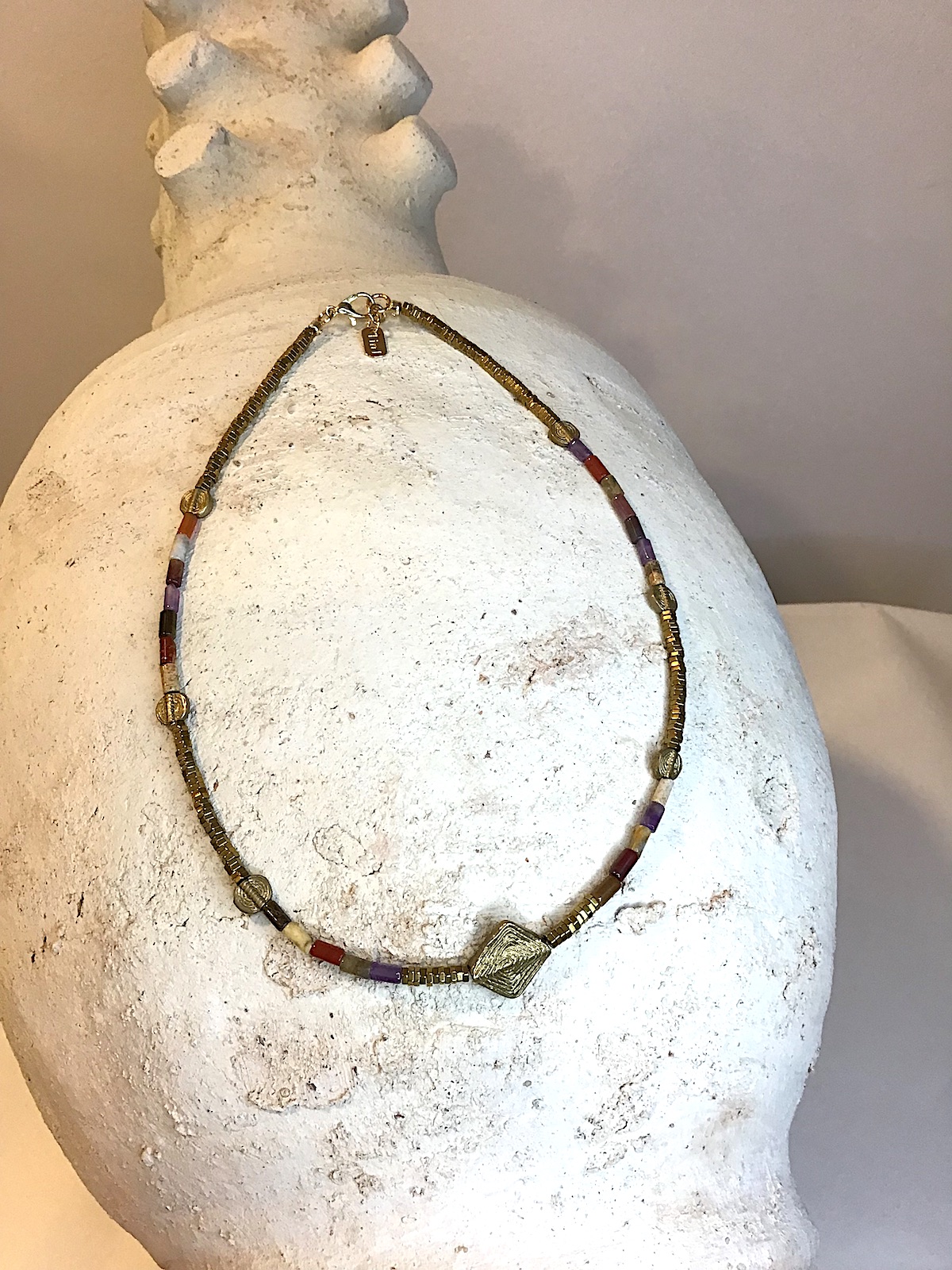 Finesse & simplicité pour ce ras du coup éclatant de pierres mélangées, hématite & bronze.